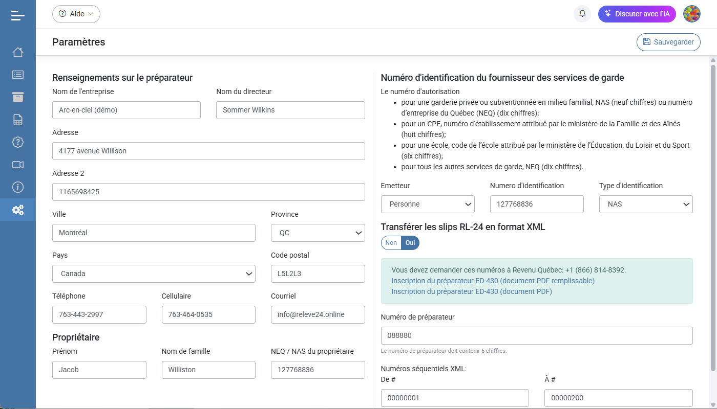 Lors de l’enregistrement, le système valide automatiquement les formats et vous avertit si quelque chose ne respecte pas les exigences. Si vous utilisez l’application pour la première fois, il est possible que vous deviez contacter Revenu Québec pour obtenir certaines informations, notamment le numéro de préparateur et vos numéros séquentiels XML.